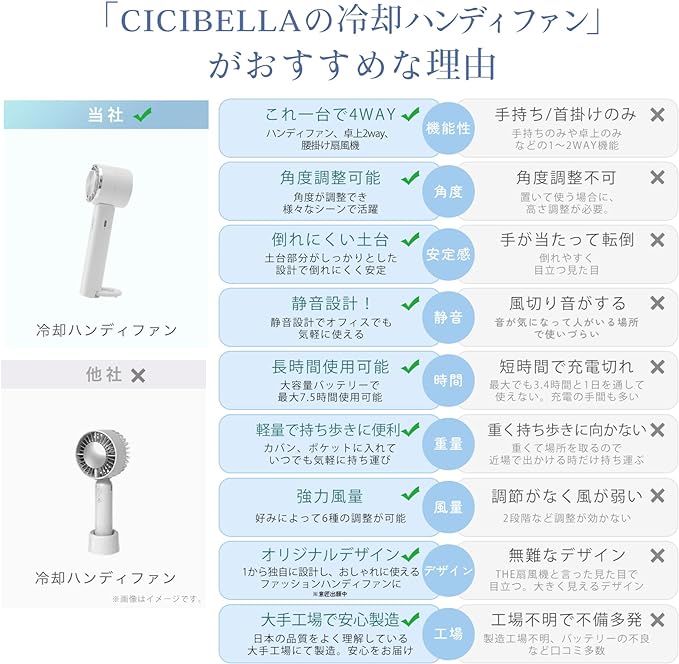 【特殊散熱功能】這款手持風扇配備了特殊的散熱板。 長按電源按鈕會啟動獨特的冷卻模式,冷卻板可將環境溫度降低至10°C左右。 可輕輕地塗抹在臉頰、額頭、手腕和頸部,立即產生清涼感。 【USB 充電】注意:充電時請勿使用。 充電時冷卻系統斷開且指示燈熄滅屬於正常現象。 內建2000mAh電池,充電需3.5小時,慢速模式可連續使用長達7.5小時。 輕巧方便攜帶,您可以將其放入包包或車內,隨時享受涼爽。 即使在炎熱的夏天,也可以調高空調溫度並使用迷你風扇,省電又有效降低溫度。 【超輕便攜式迷你尺寸】CICIBELLA 手持風扇配有登山扣,攜帶非常方便。 緊湊的尺寸適合大多數手提包,方便攜帶。 此外,CICIBELLA電風扇還可以作為桌上型風扇使用,使得折疊電風扇的使用非常方便。 僅重 146 克,是旅行或辦公室的完美伴侶,也是炎熱夏天的理想禮物。 【三級風力調節】此風扇採用6葉片設計,提供強勁風力。 配備3級風力調節功能,滿足不同需求。 它還配備了散熱板,可根據環境進行精確調節,提供舒適的體驗。 它將是家庭、辦公室和其他場所的理想選擇。 尺寸:20.7 x 5.7 x 5.4 cm ------------------------------ ***貨品只提供訂購*** 📍預計到貨時間 付款後約2-3星期工作天 (*不包含星期六/日及公眾假期) 到貨後有取貨通知💕 請大家自行斟酌可等候的時間🙇🏻♀️ (發貨/通知次序會根據下單時間) 貨運需時🕑謝謝諒解❤️ 如有任何更改,將會通知有關事宜。 *購買電器注意以下事項::: 1. 需注意貨品如有任何損壞等狀況: 本店不設退回日本廠商處理,需自行承擔一切風險。 2. 不包括任何保養/維修